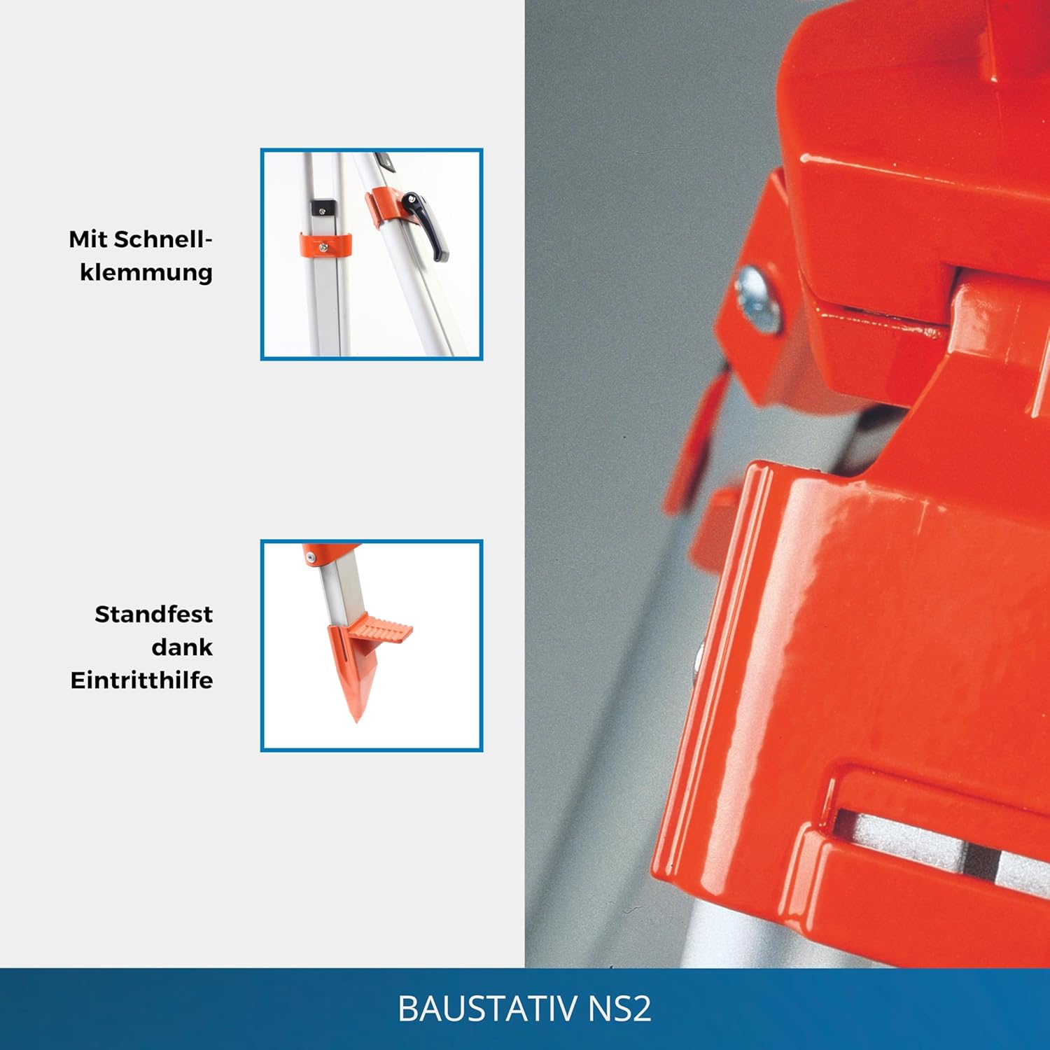 Die mittelschweren Nivellierstative eignen sich dank der flachen Stativteller sowohl für Bau- und Ingenieurnivelliere als auch für Rotationslaser. Ein Durchlass ermöglicht die Verwendung eines optischen Lotstrahls. Das verarbeitete Aluminium verleiht dem Stativ eine hohe Robustheit und Wetterbeständigkeit. Über die Eintritthilfe lassen sich die Stativbeine auch in unwegsamen Gelände standfest positionieren.