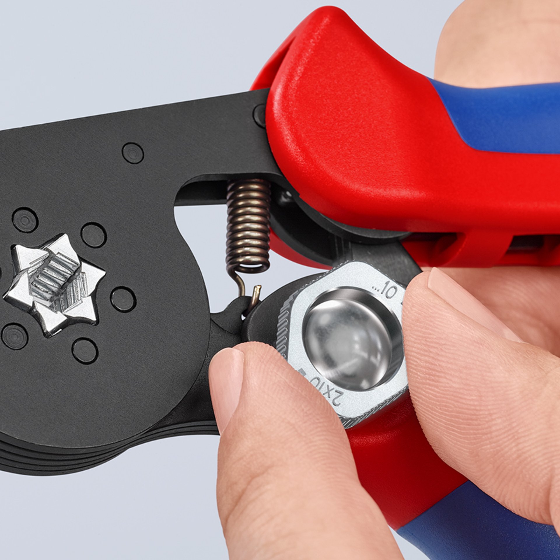 97 53 14 SB Selbsteinstellende Crimpzange für Aderendhülsen Für Aderendhülsen bis zu 16 mm². Automatische Einstellung auf die gewünschte Aderendhülsengröße für genaues und schnelles Crimpen. Normkonformes Verpressen von Aderendhülsen nach DIN 46228 Teil 1 + 4. UL-Zulassung in Verbindung mit KNIPEX-Aderendhülsen 97 99 330 - 399. Gleichbleibend hohe Crimpqualität durch Zwangssperre (entriegelbar). Crimpdruck ist werkseitig präzise eingestellt (kalibriert). Hohe Crimpkraft durch effiziente Hebelübersetzung. Geringe Griffweite. Ergonomische, handliche Bauform, leichtgängig und mit geringem Gewicht. Chrom-Vanadin-Elektrostahl in Sondergüte, ölgehärtet. mit Sechskant-Pressung. auch für alle Twin-Aderendhülsen bis 2 x 10 mm² oder 2 x AWG 8.