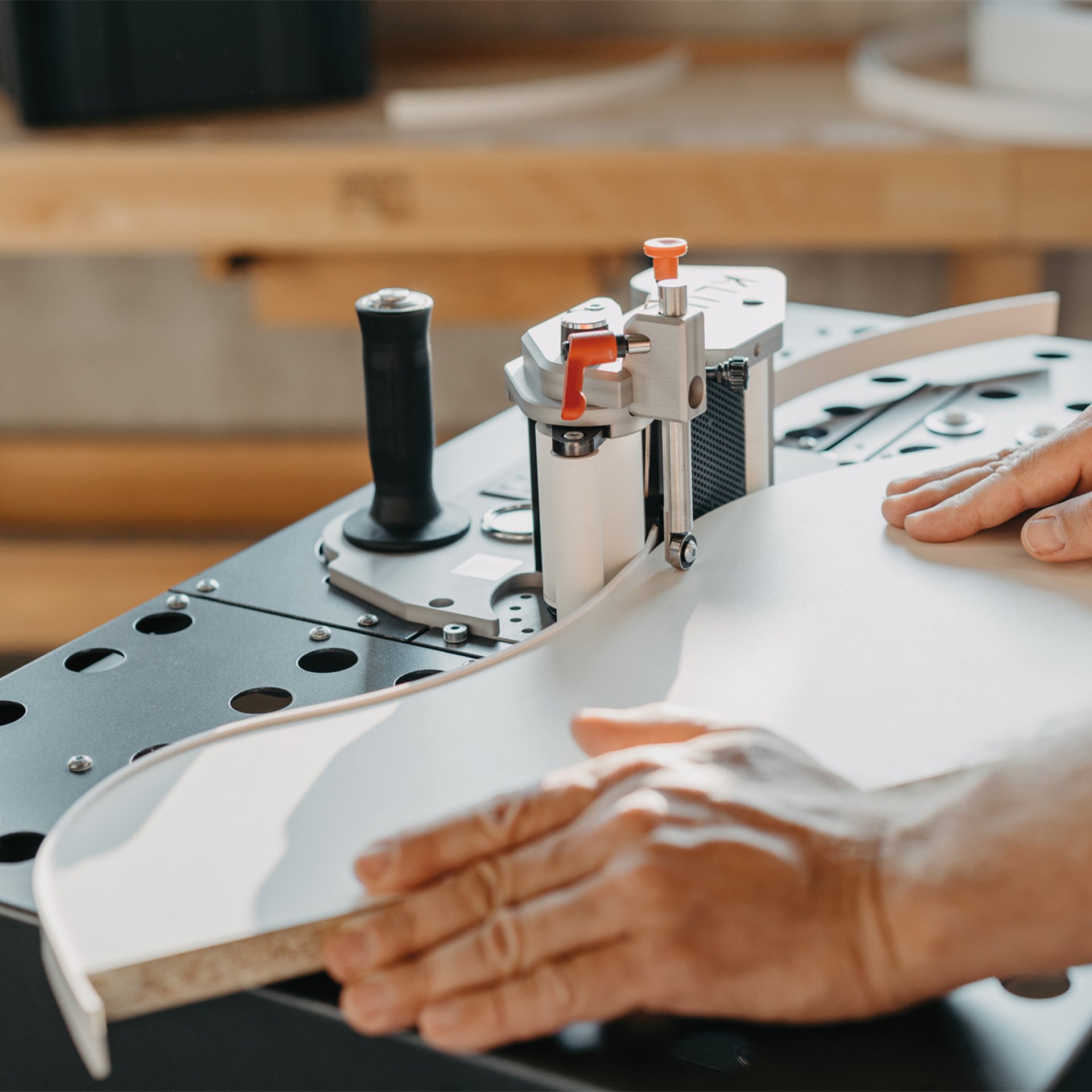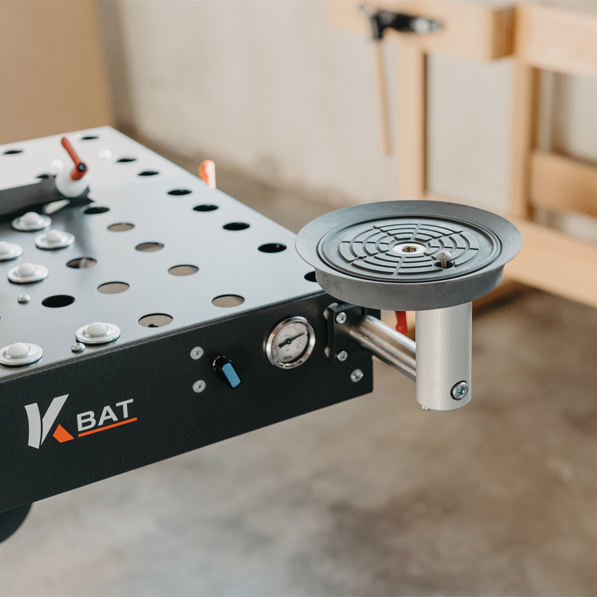 In Verbindung mit dem Bearbeitungstisch BAT wird aus dem mobilen Nullfugenbekanter ein halbstationäres System. Durch die perfekte Werkstückauflage mit versetzbaren Kugelrollen sind fast alle Bekantungssituationen möglich. Es können perfekt gerade, schräge, gekrümmte und runde Plattenwerkstoffe sowie Formteile verarbeitet werden. Schräge Schnittflächen von bis zu 55° sind sehr einfach möglich. Die dazugehörigen 360° Kugelrollen sorgen für die variable Positionierung bei Formteilen und geschlossenen Konturen. Der Winkeltisch ermöglicht eine pneumatische Winkelverstellung zum Aufbringen von Kanten auf schrägen Schnittflächen bis 55° Neigung bei kleineren Werkstücken. Die pneumatische Entriegelung sowie Dämpfung der Winkeleinstellung erleichtern das Handling.